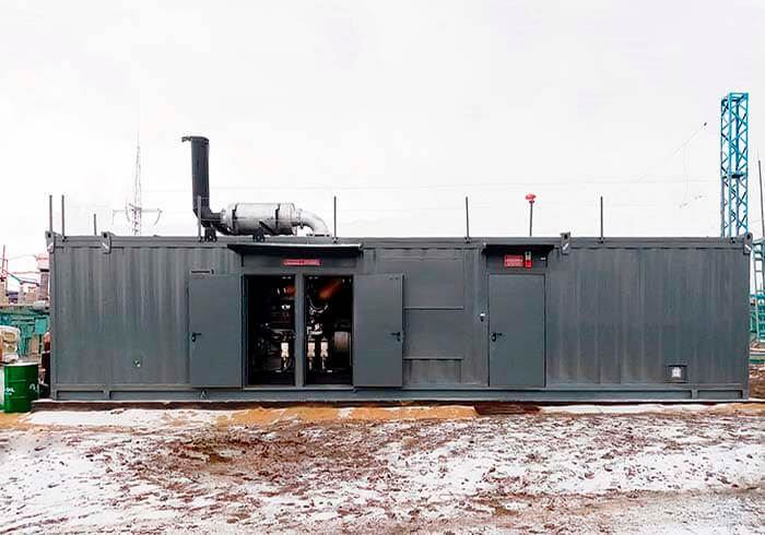 Электроагрегат установлен в утепленный блок-контейнер "Север". Контейнер выполнен из панелей типа "Сэндвич" и автоматизирован по 3 степени в соответствии с ГОСТ Р 54437-2013.